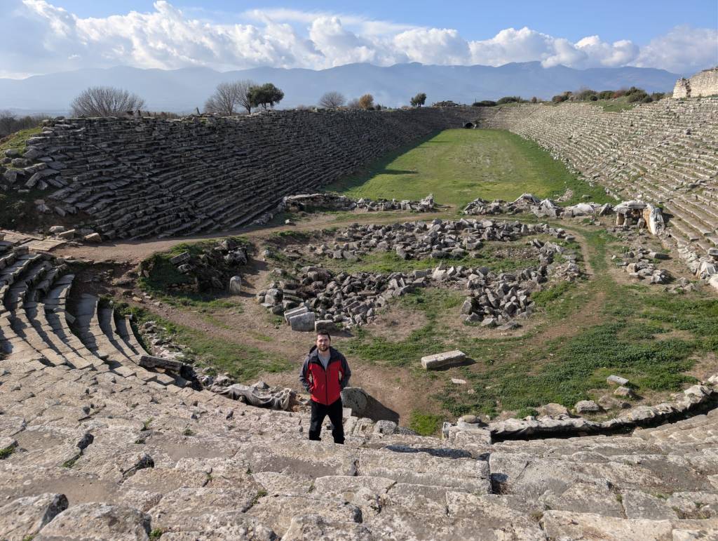 Afrodisyas‘ın benim için en etkileyici kısmı stadyumu. Belki şansım yaver gitti ama her ziyaretimde stadyumda başka turist olmadan hep tek başımaydım. Stadyumun doğu ucundaki taş oturaklara oturduğumda Karıncalı dağı stadyumla beraber enfes bir manzara oluşturuyor. Taş oturakların arasından fırlayan otlar stadyuma ürpertici bir hava, terkedilmişlik ve dinamizm katıyor. Normal şartlarda yüzlerce yıl önce dolu olan stadyumda tek başıma oturmak liminal alan korkumu hafiften tetikliyor.