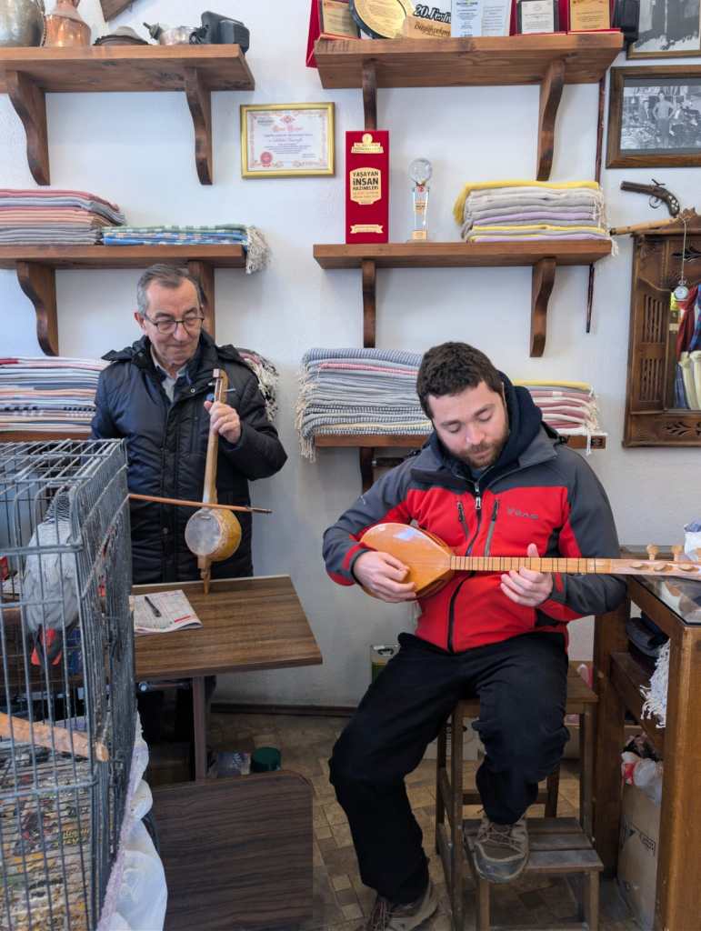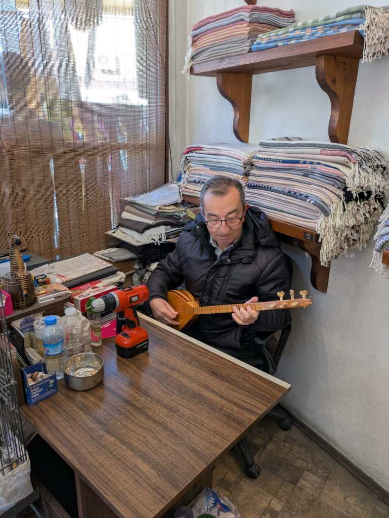 Girdiğimiz ikinci dükkanda dükkan sahibiyle beraber uzunca ve keyifli bir zaman geçirdik. Dükkan sahibi Salahattin Amca (Salahattin Kaçanoğlu) Unesco tarafından “Yaşayan İnsan Hazinesi” seçilmiş bir dokuma ustası ve sanatçısı. Yurtdışında sempozyum ve fuarlara dokuma sanatçısı olarak katılıyor ve Buldan dokumasını dünyaya tanıtıyor. Sonradan internetten baktığımda kendisi hakkında birçok yazı ve söyleşi gördüm. Kendisi aynı zamanda Buldan eski halk eğitim müdürü ve müzisyen. Dükkanında curasını ve kabak kemanesini bize çaldı. Oradan da bir şal alıp gezimize devam ettik.